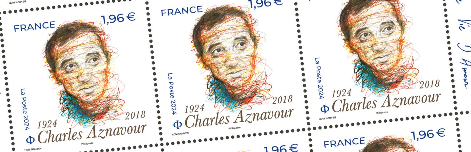 Ce timbre-poste, première création philatélique d’Hom Nguyen, a été émis le 30 mai 2024 à l’occasion du centenaire de l’auteur-compositeur-interprète, acteur et écrivain franco-arménien (1924-2018).