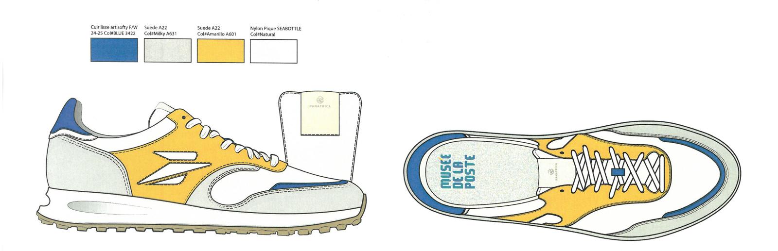 En octobre 2023, un partenariat est engagé avec le fabricant PANAFRICA. Le travail se fait en lien avec la Direction de la Marque du groupe La Poste afin de positionner le logo La Poste de manière cohérente et conforme. Deux modèles sont retenus, l’un jaune et l’autre bleu, chacun décliné en onze pointures. Cette étape permet également de définir le budget, les quantités à produire et le devis.